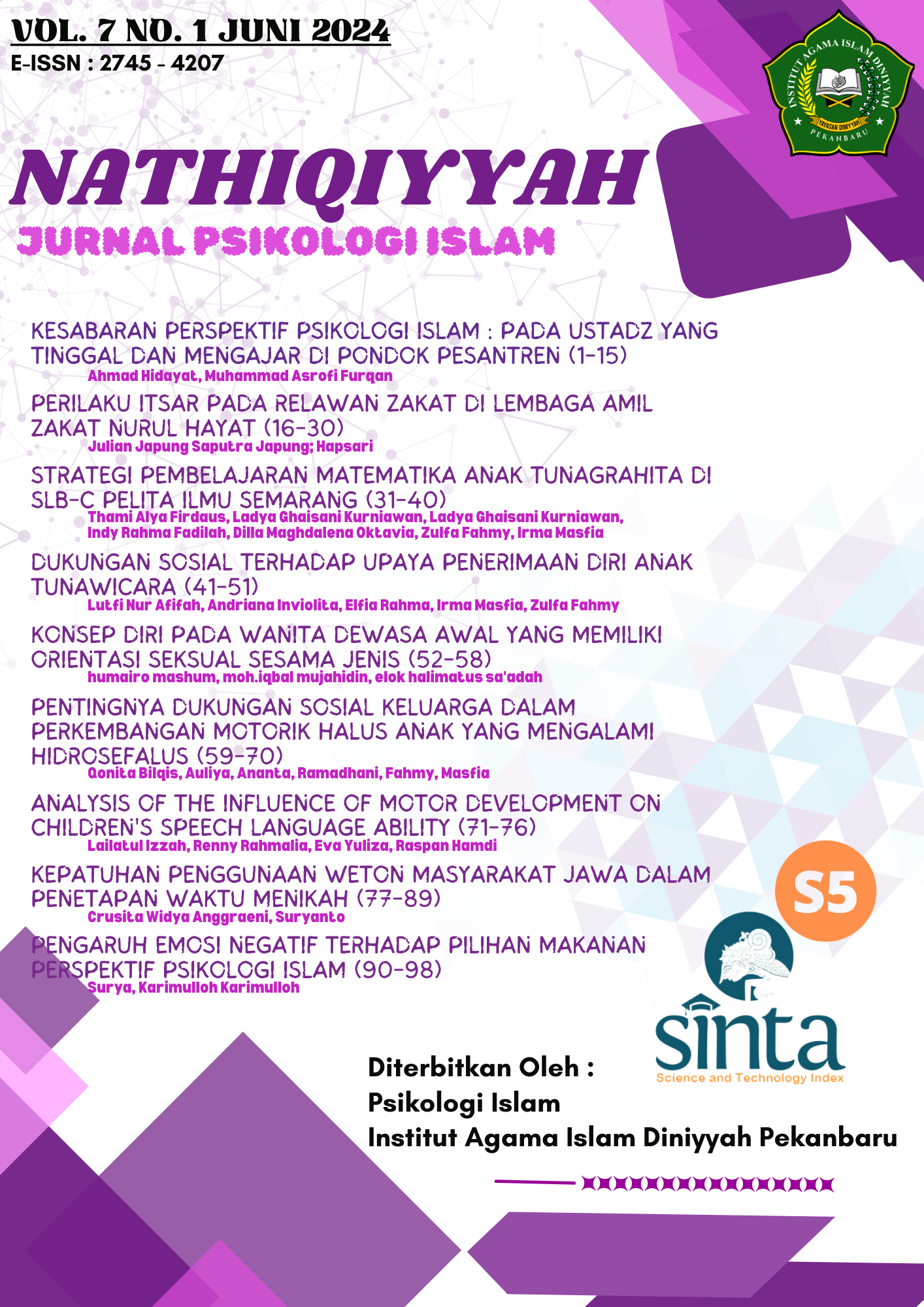 Nathiqiyyah : Islamic Psychology Journal published by Islamic Psychology Program, Institut Agama Islam (IAI) Diniyah, Pekanbaru, Indonesia. Which is published twice a year in June and December. Nathiqiyyah contains articles, that can be published in the Journal are articles from empirical research (quantitative or qualitative approaches), literature studies or thought studies which are seen as contributing to the Islamic psychology especially with the theme of integration of psychology and Islam, integration of psychology and islamic education and development of general psychology, which done individually or in groups. The primary target audiences of this journal are academicians, practitioners, graduate students and other professionals with interest in Islamic Psychology. There are two version of publication; prin out (p) with ISSN : 2614-7815 and electronic (e) with ISSN Online : 2745-4207